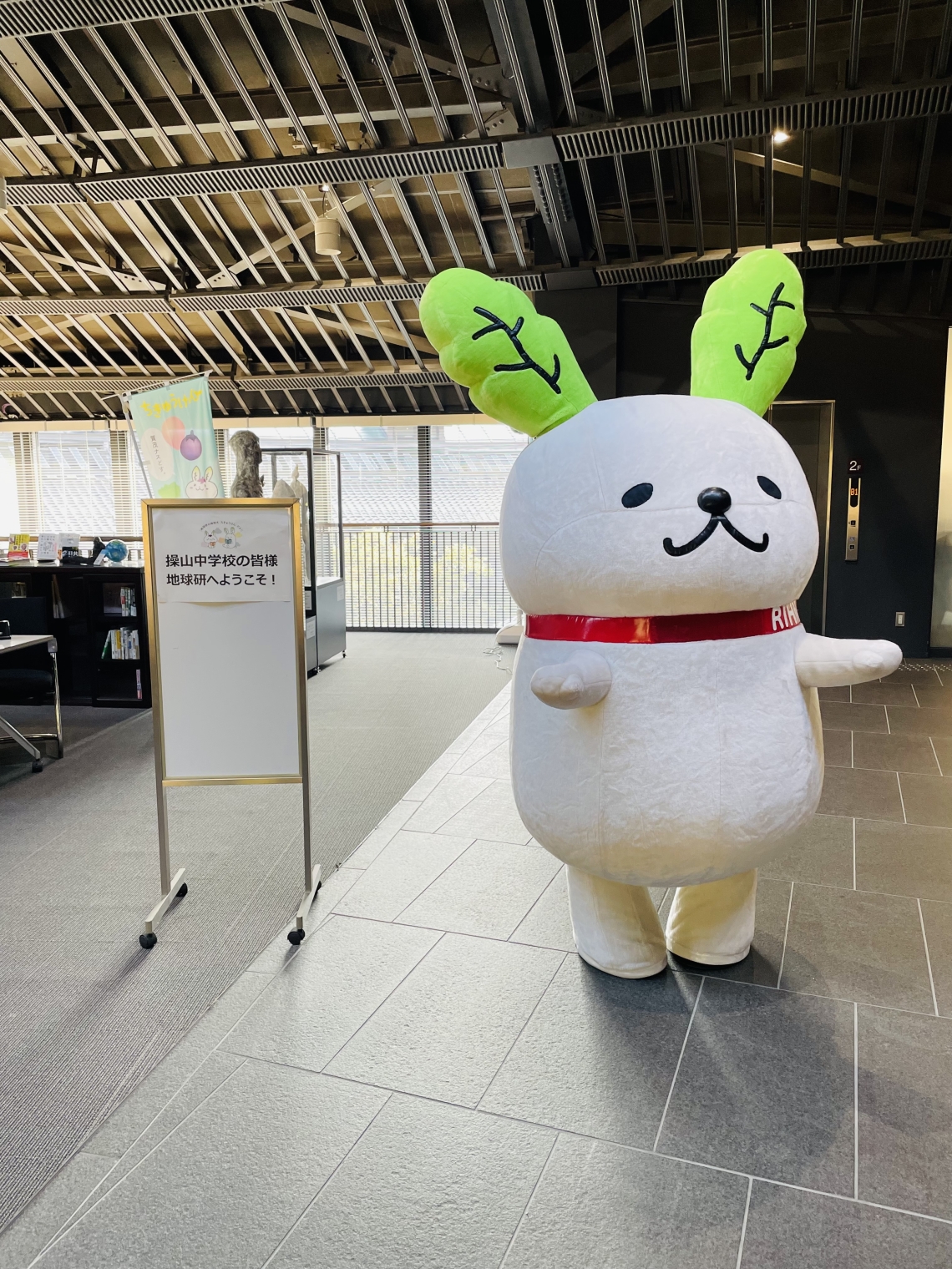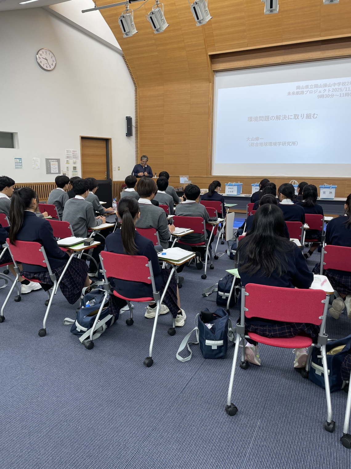 お知らせ 2025.11.17 岡山県立岡山操山中学校「未来航路プロジェクト」(11月14日、大山PL・中出道子) 岡山県立岡山操山中学校のみなさんが、総合的な学習の時間「未来航路プロジェクト」の京都研修で地球研を訪問、大山PLと地球環境問題の解決について考えました。お出迎えの「地球犬」は生徒さんに大人気でした。